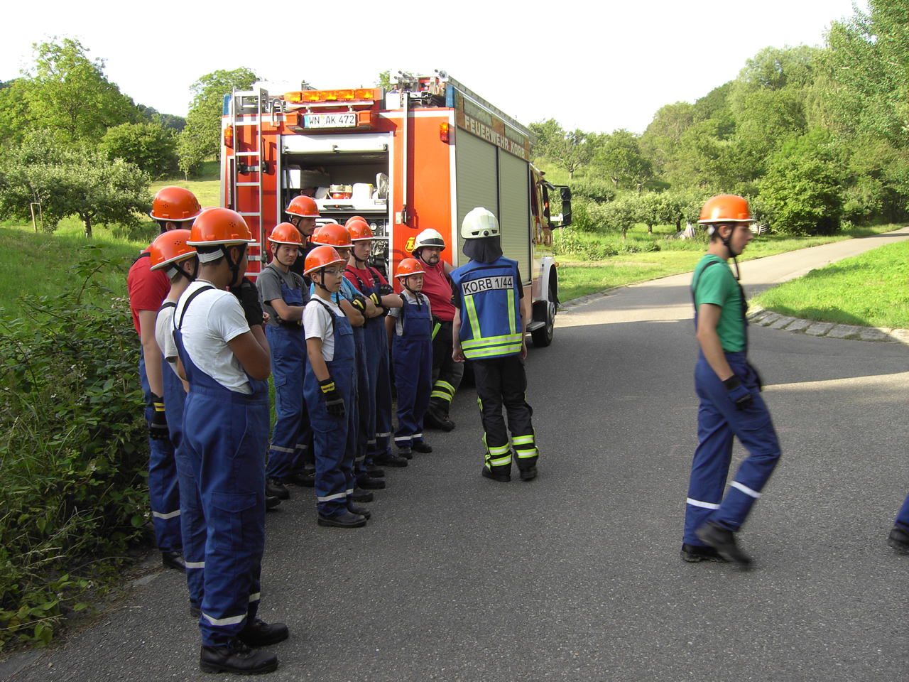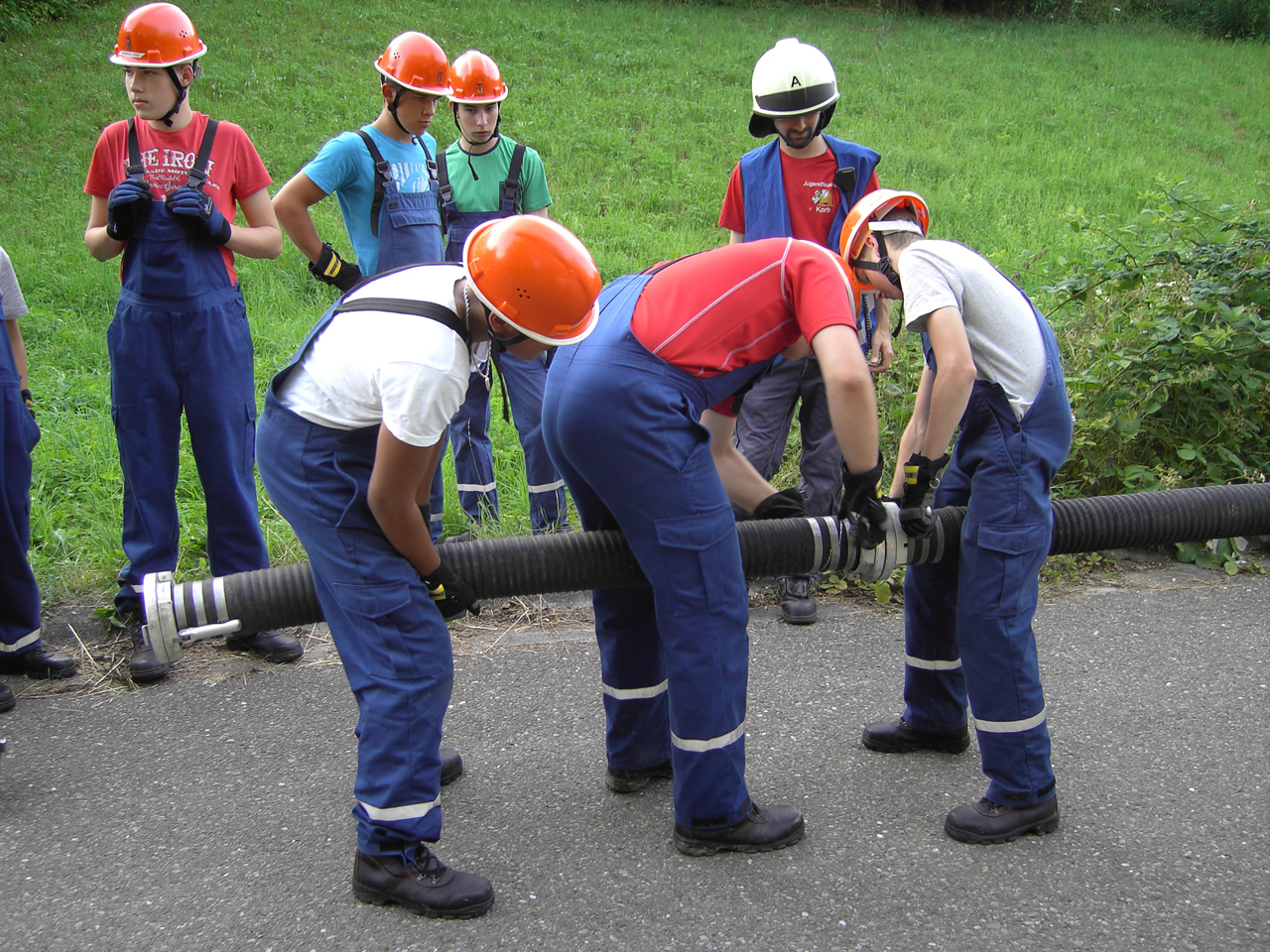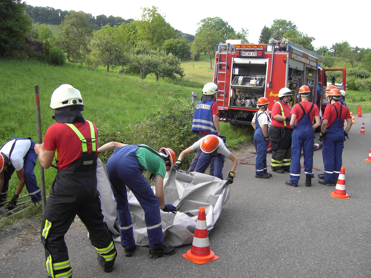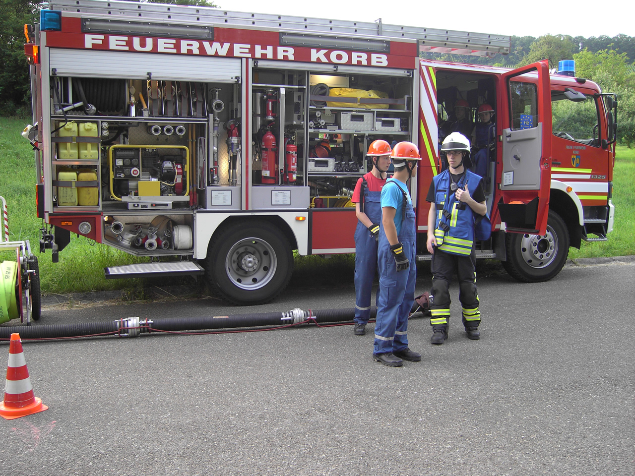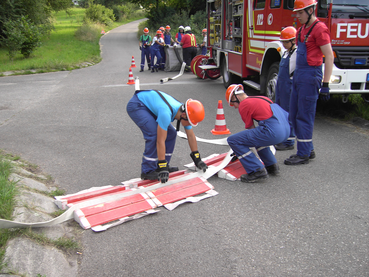 Das LF16 war in unserem Szenario lediglich mit einer Staffel besetzt, was eine dynamische Aufgabenverteilung zur Folge hatte. Der Wassertrupp brachte Schlauchtragekörbe zum Verteiler und besetzte diesen. Der Angriffstrupp bereitete den Löschangriff vor und wartete auf eine stehende Wasserversorgung.