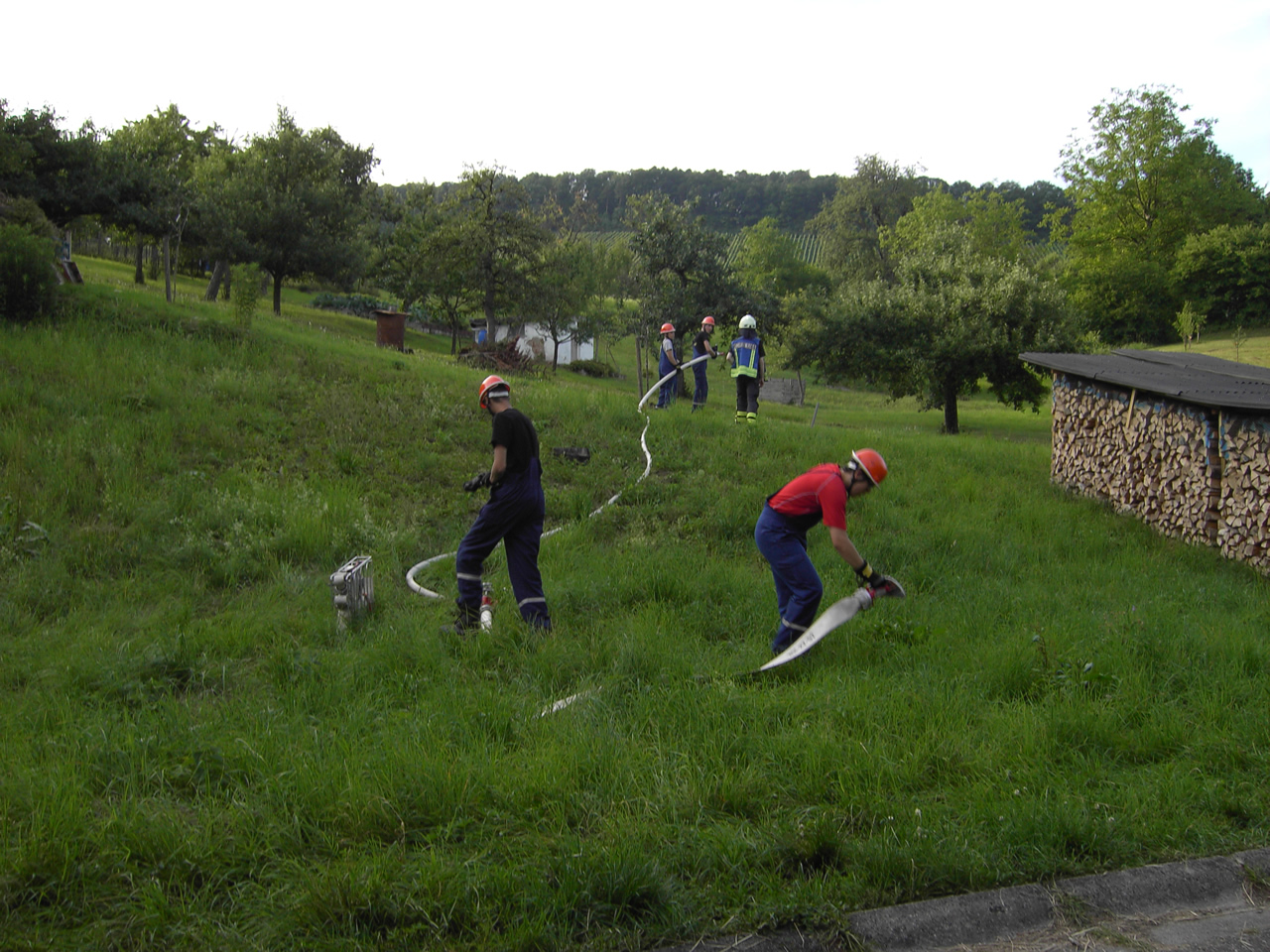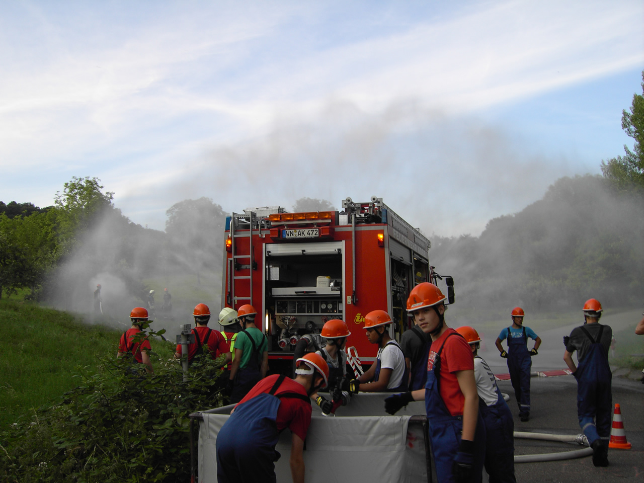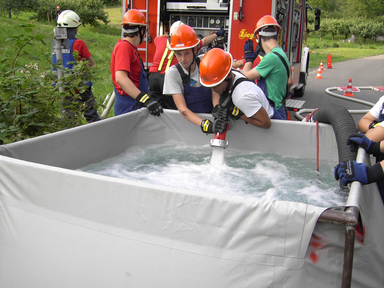 Solch ein Szenario wurde bei der letzten Übung angenommen. Als Abhilfe wurde ein Sammelbecken aufgebaut. Dieses würde im Einsatz nun Wasser durch Fahrzeuge im Pendelverkehr erhalten.