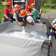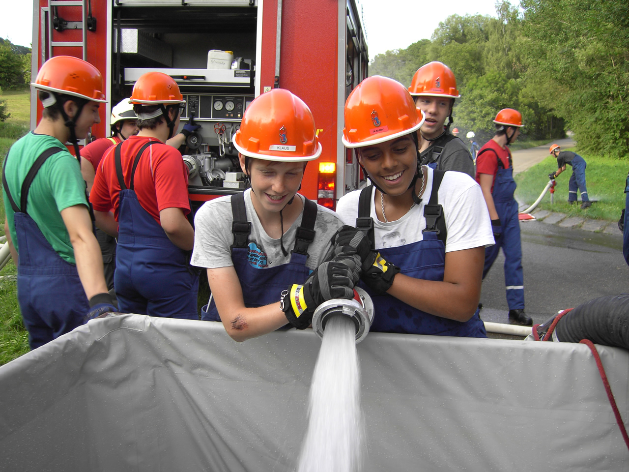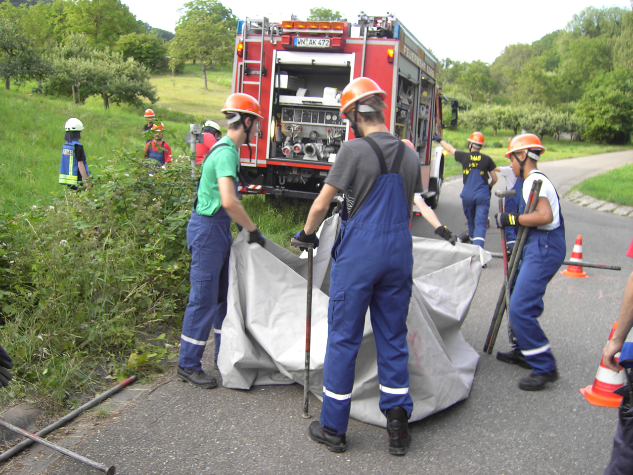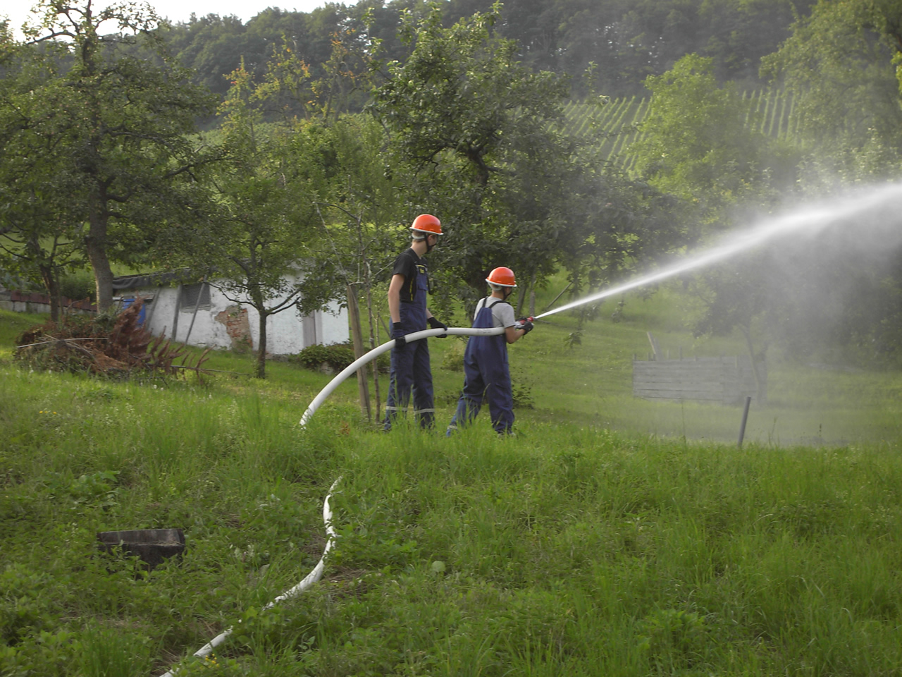 Solch ein Szenario wurde bei der letzten Übung angenommen. Als Abhilfe wurde ein Sammelbecken aufgebaut. Dieses würde im Einsatz nun Wasser durch Fahrzeuge im Pendelverkehr erhalten.