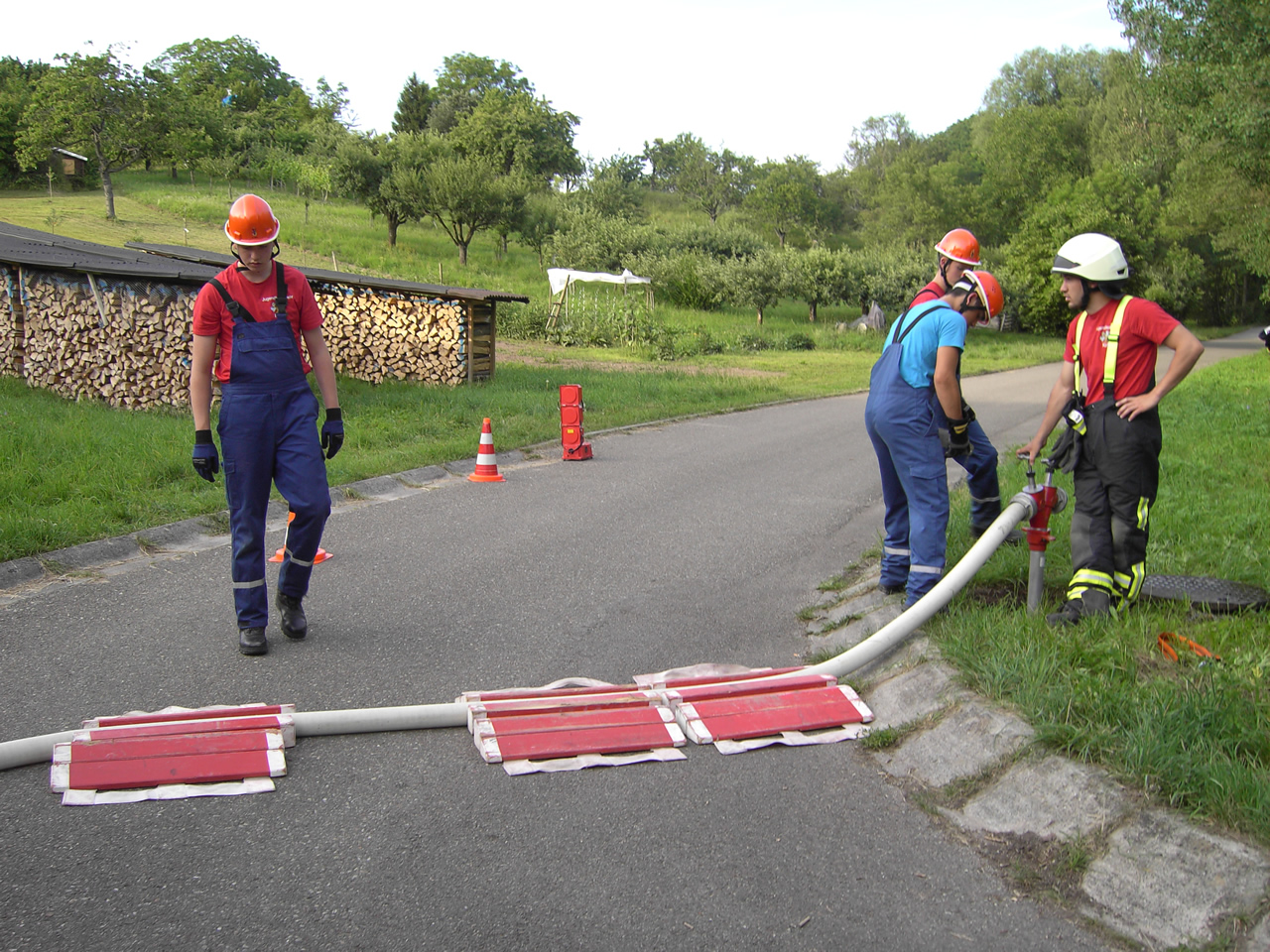 Die Besatzung des MTW kümmerte sich währenddessen um die Saugleitung und die Wasserversorgung vom Hydrant zum Sammelbecken, sowie das setzten von Schlauchbrücken.