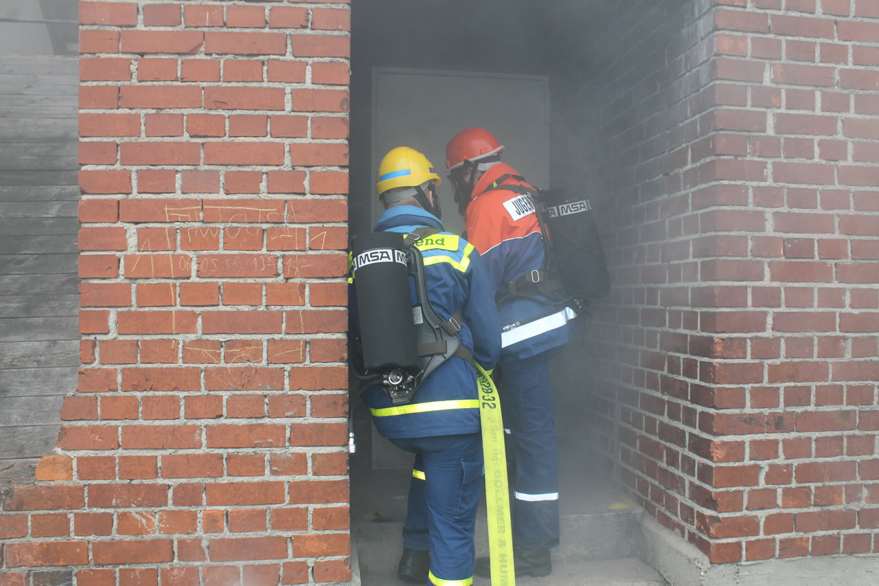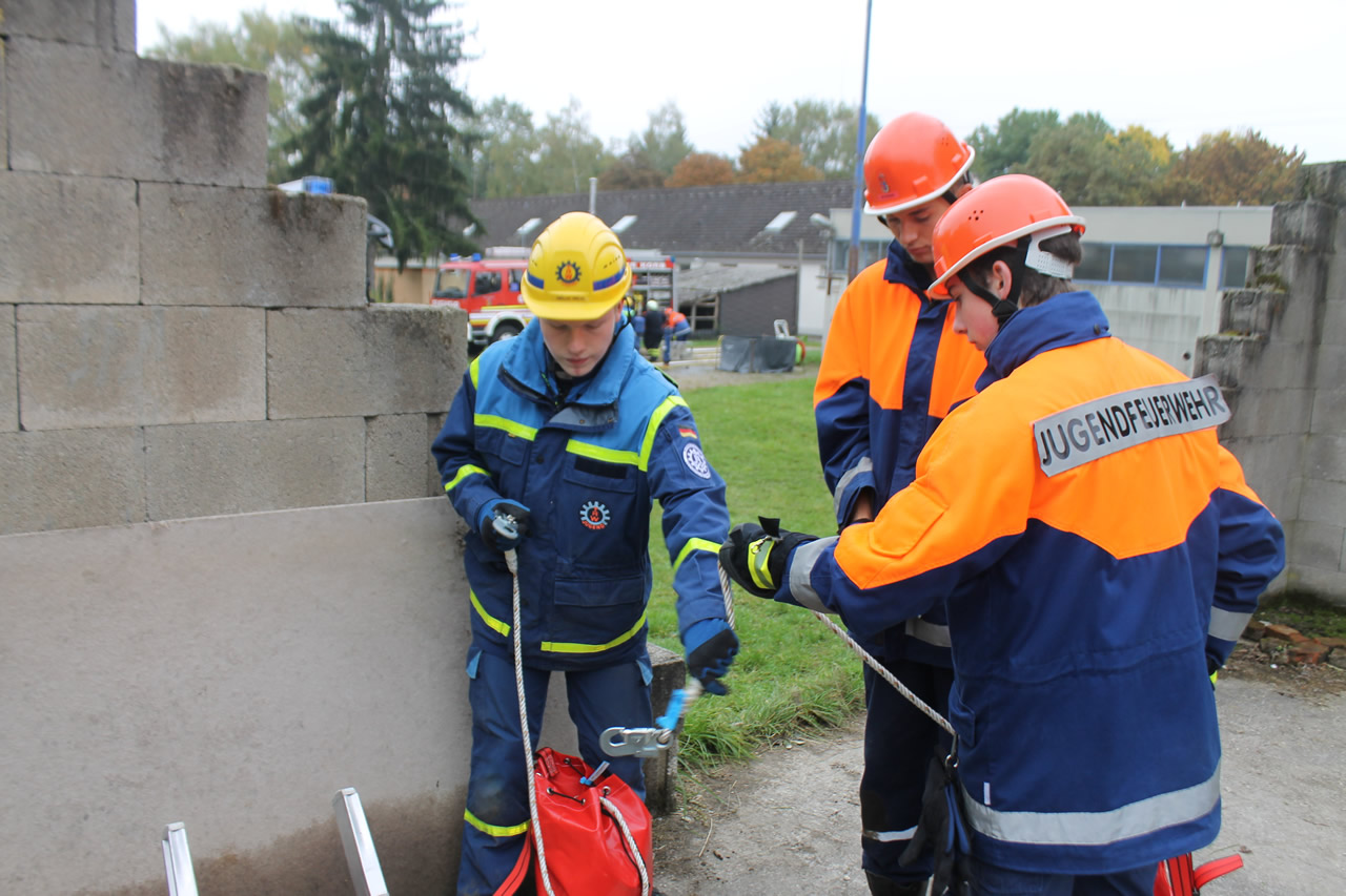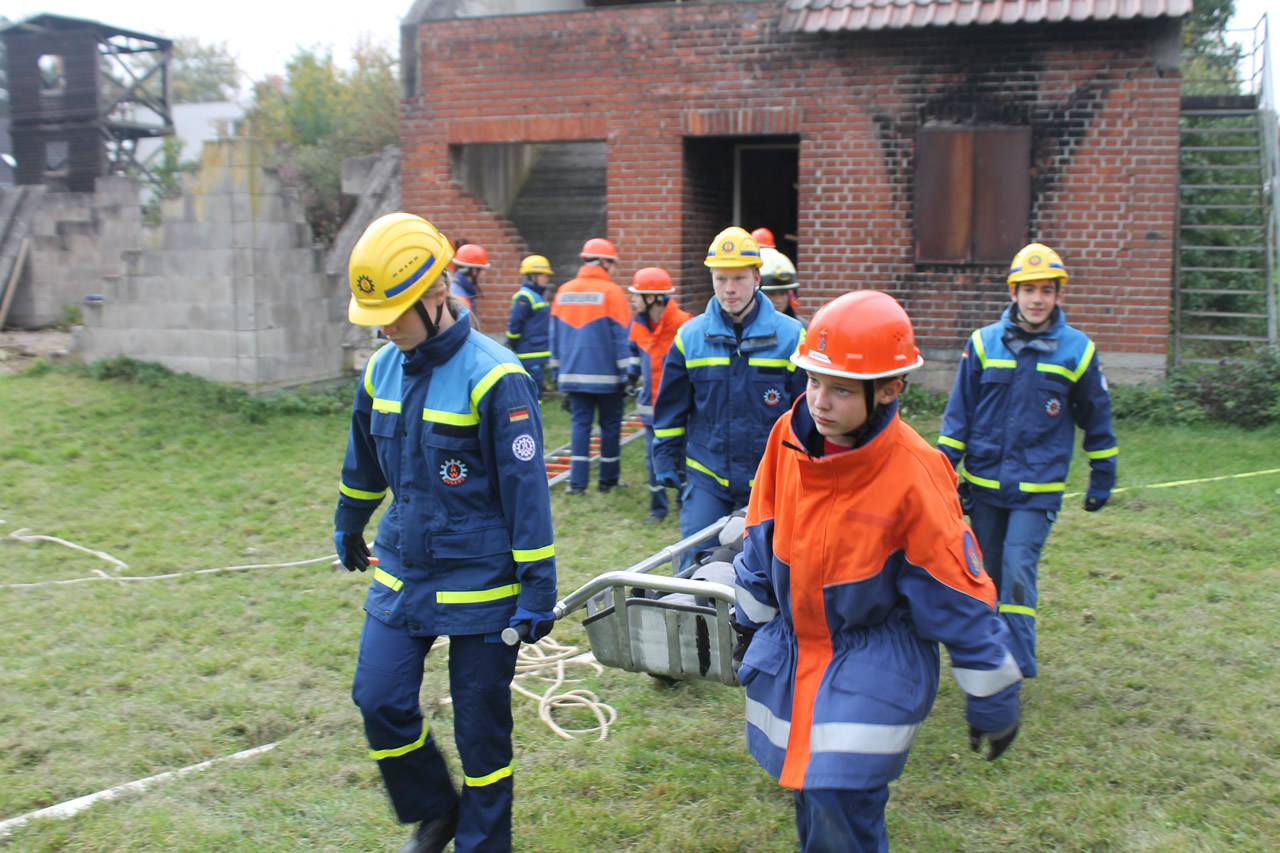 Bei dieser galt es einen Löschangriff aufzubauen, um einen fiktiven Buschbrand zu löschen. Währenddessen durchsuchten zwei weitere Gruppen das Übungsgelände nach drei vermissten Personen. Dabei musste eine Gruppe unter Atemschutz vorgehen, da das zu durchsuchende Gebäude stark verraucht war. Nach kurzer Zeit konnten in jedem Keller der beiden betroffenen Gebäude eine Person gefunden und mittels Schleifkorb und Bergeschleppe gerettet werden. Nach der Rettung wurden beide Personen erstversorgt und an den Rettungsdienst übergeben. Inzwischen wurde die dritte Person im Dachgeschoss aufgefunden und gemeinsam mithilfe des Leiterhebels gerettet. Damit waren alle Personen gerettet und alle Aufgaben erfolgreich abgeschlossen.