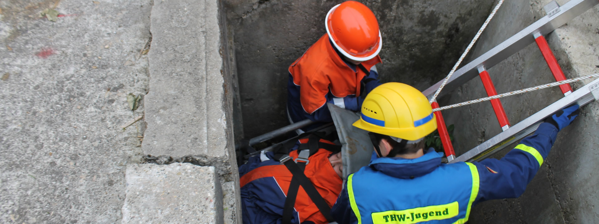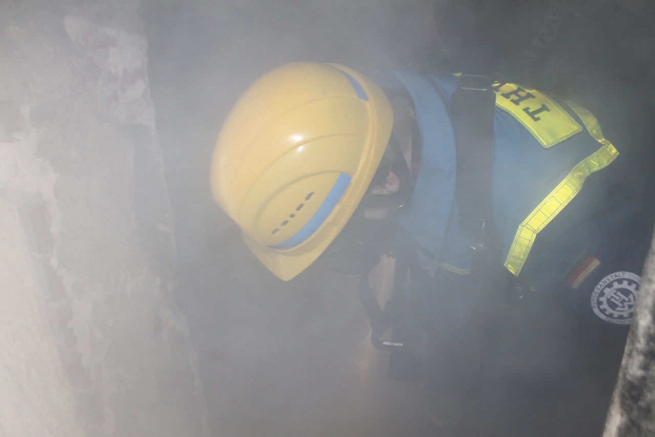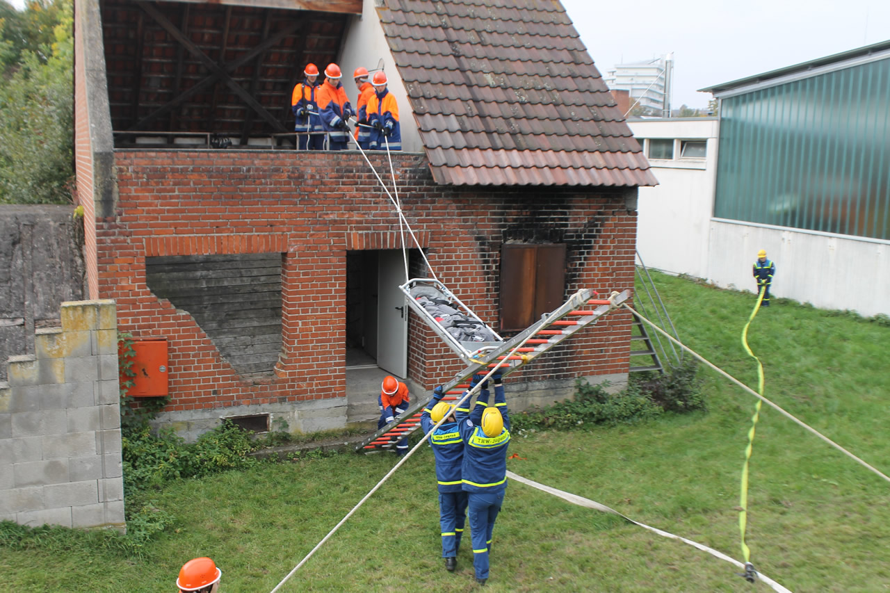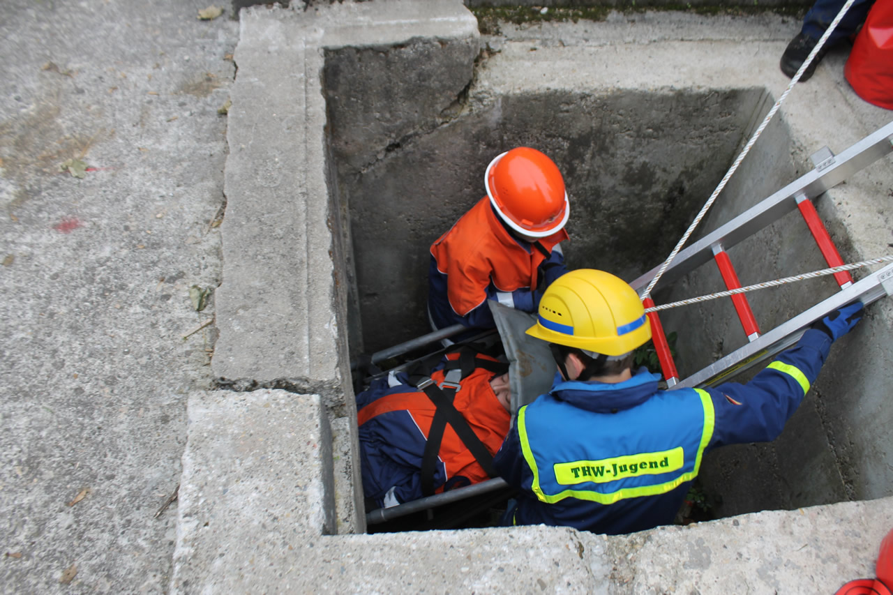 Parallel bildete das THW das Retten von Personen mithilfe von Leitern und Schleifkorb aus. So wurde eine Person von einem fünf Meter hohen Übungsturm gerettet. Dabei kam ein sogenannter Leiterhebel zum Einsatz, bei dem die Personen im Schleifkorb liegend mit der Leiter abgelassen werden. Als nächstes musste eine Person im Tunnelsystem gefunden und mittels Schleifkorb gerettet werden. Die besondere Schwierigkeit bestand darin, mit dem wenigen Platz im Tunnel unter dem Übungsgelände zurecht zu kommen und die verletzte Person zu retten.