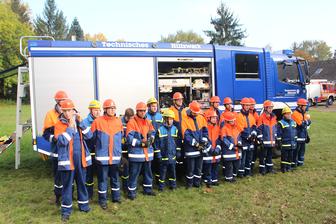 Nachdem alle drei Gruppen alle Stationen absolviert hatten, zeigte die Feuerwehr noch allen Nachwuchskräften, wie das Dach von einem Fahrzeug entfernt wird. Im Anschluss daran gab es für alle noch eine Führung durch die Fahrzeughalle des THWs, um die verschiedenen Fahrzeuge zu zeigen. Parallel dazu wurde noch eine Abschlussübung vorbereitet.