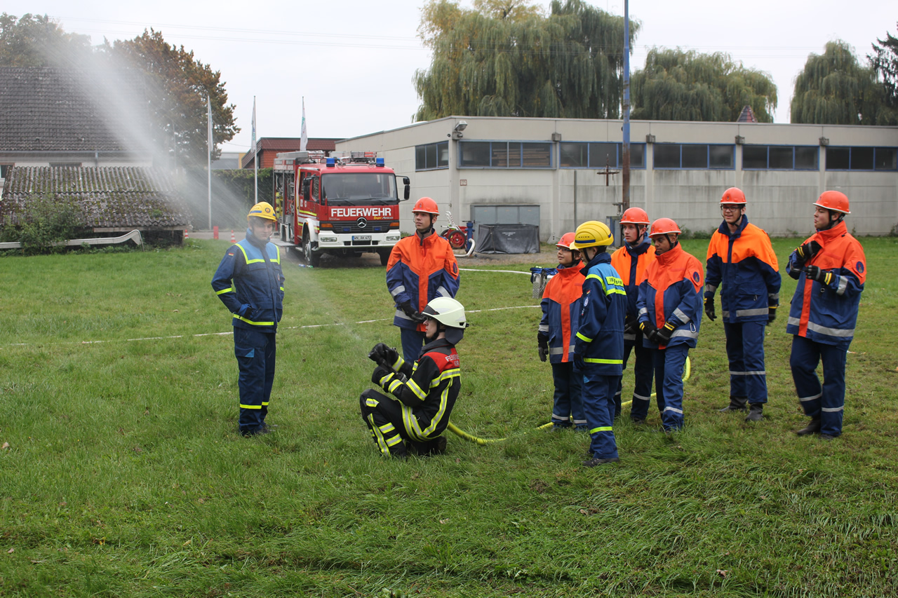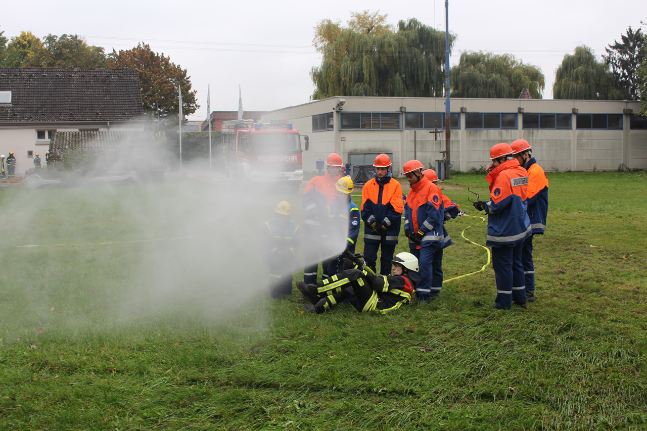 An einer Station wurde von der Feuerwehr der klassische Löschangriff ausgebildet. Dabei galt es die Schlauche und Verteiler zu verlegen und den richtigen Umgang mit dem Strahlrohr zu üben. Auch das richtige Vorgehen im Innenangriff wurde ausgiebig geprobt. Das Aufsetzen von Atemschutzgerät und Schutzmaske war ein besonderes Highlight. Dabei handelte es sich natürlich nur um Übungsgeräte. Aber auch diese reichen aus, um den Jugendlichen zu vermitteln, welche Einschränkungen das Tragen der Maske und des Atemschutzgerätes mit sich bringt.