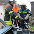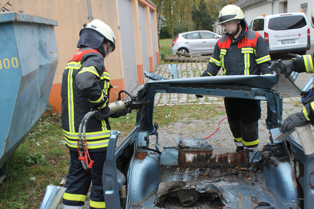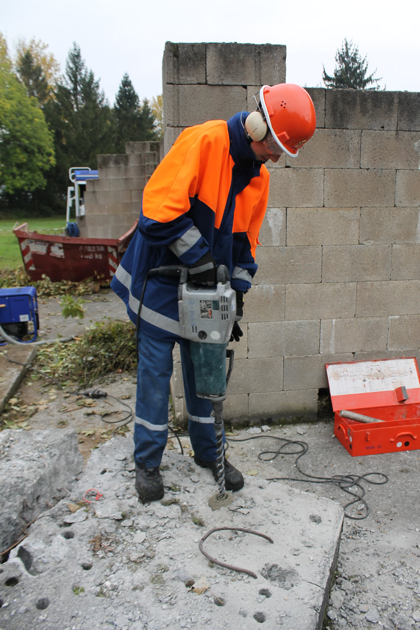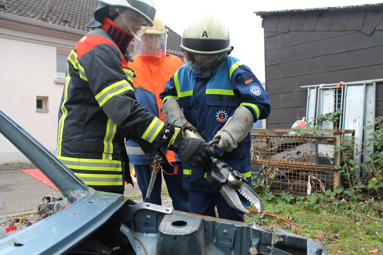 An der letzten Station bildeten THW und Feuerwehr gemeinsam die Themen Gesteinsbearbeitung und Technische Hilfeleistung an Fahrzeugen aus. So konnte der Bohr- und Aufbrechhammer an einer Betonplatte ausprobiert werden. Mit diesem werden im Einsatzfall Wand- und Deckendurchbrüche geschaffen, wenn auf anderem Weg der Zugang zu verschütteten Personen nicht möglich ist. An einem Übungsfahrzeug konnte dann das hydraulische Rettungsgerät der Feuerwehr ausprobiert werden. Dabei erfuhren die Jugendlichen die vielseitigen Einsatzmöglichkeiten vom hydraulischer Schere und Spreizer und welche Kräfte diese Geräte entwickeln.