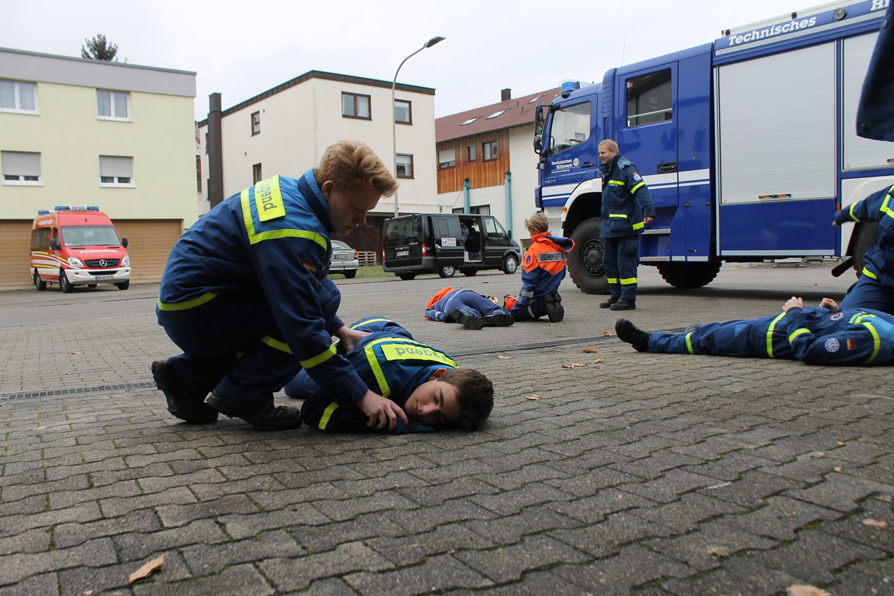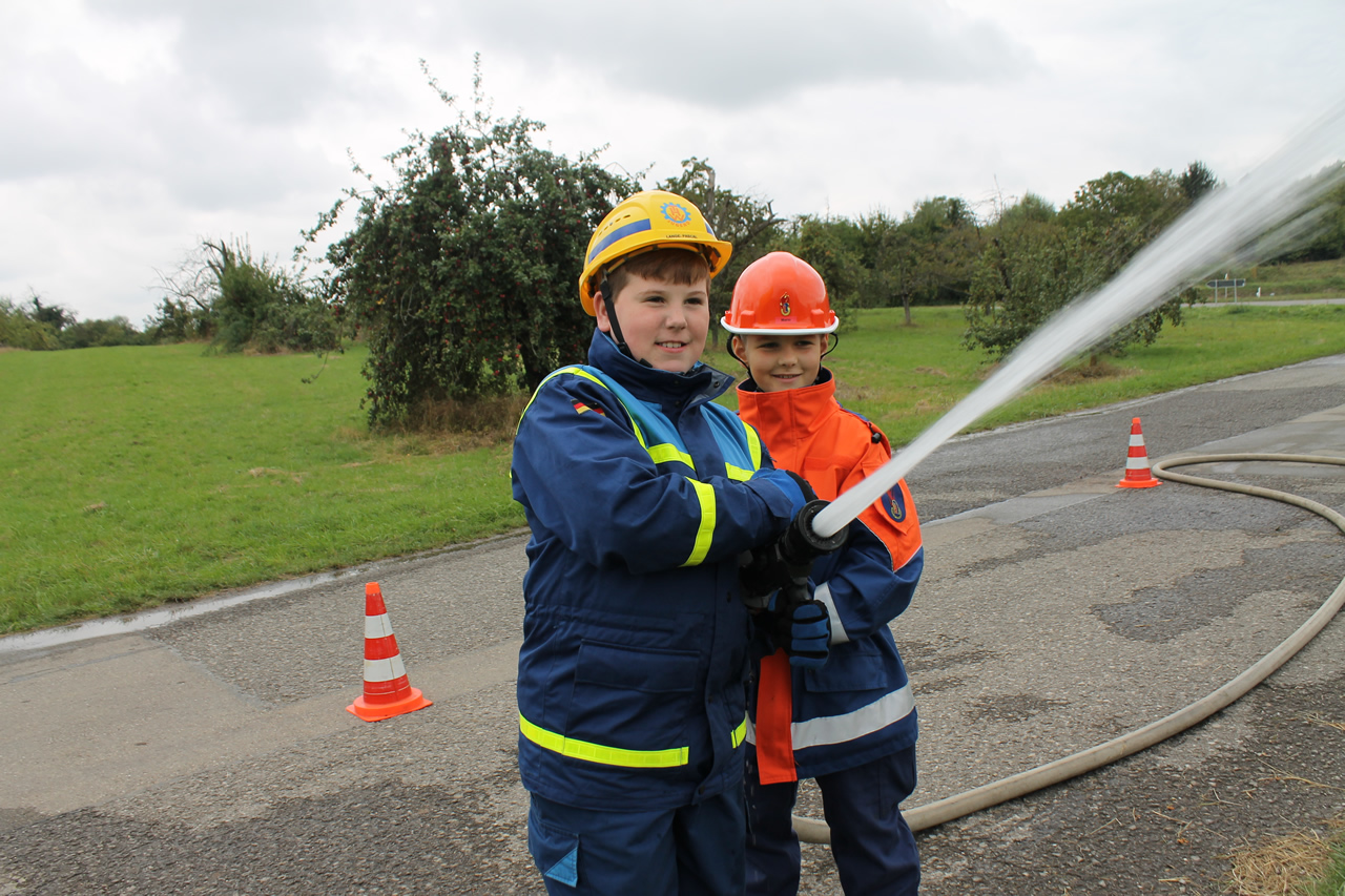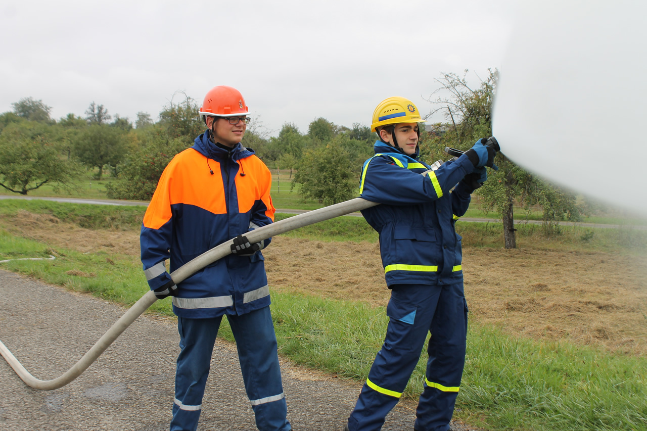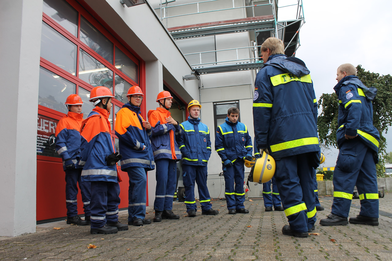 Der Tag begann zunächst mit einer kurzen Unterweisung in das Thema Gefahrgut. Das hier Erlernte wurde im Tagesverlauf noch benötigt. An einer der verschiedenen Ausbildungsstationen mussten die Jugendlichen eine Tauchpumpe in Betrieb nehmen und Wasser aus einem Becken abpumpen, welches einen vollgelaufenen Keller simulierte.