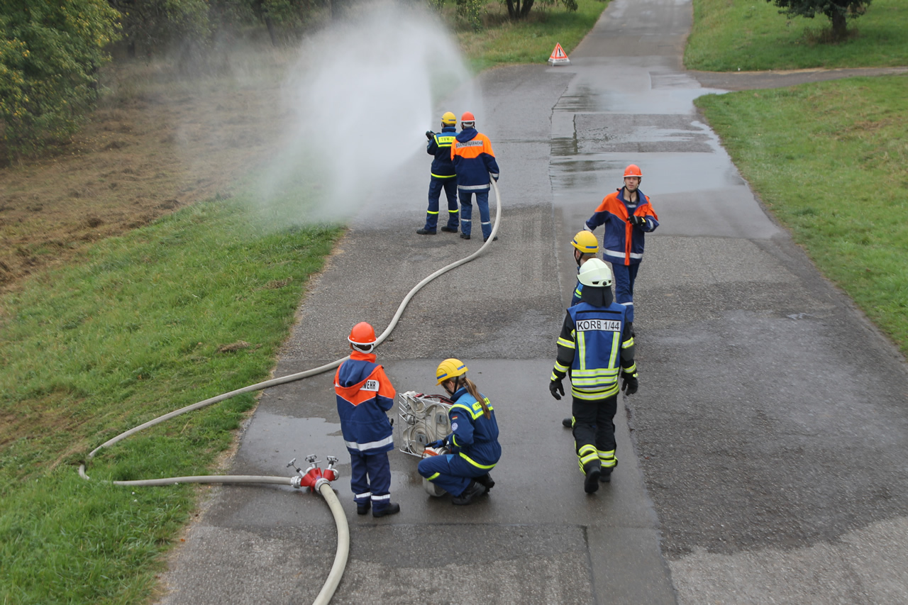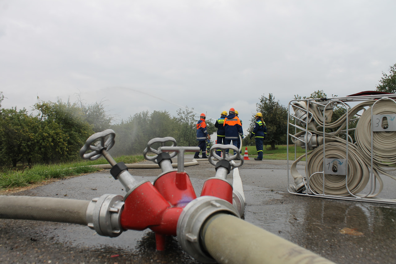 An der letzten Station wurde noch der Löschangriff geübt. Hierbei sollte möglichst schnell die komplette Angriffsleitung mit Verteiler stehen, um den Brand bekämpfen zu können.