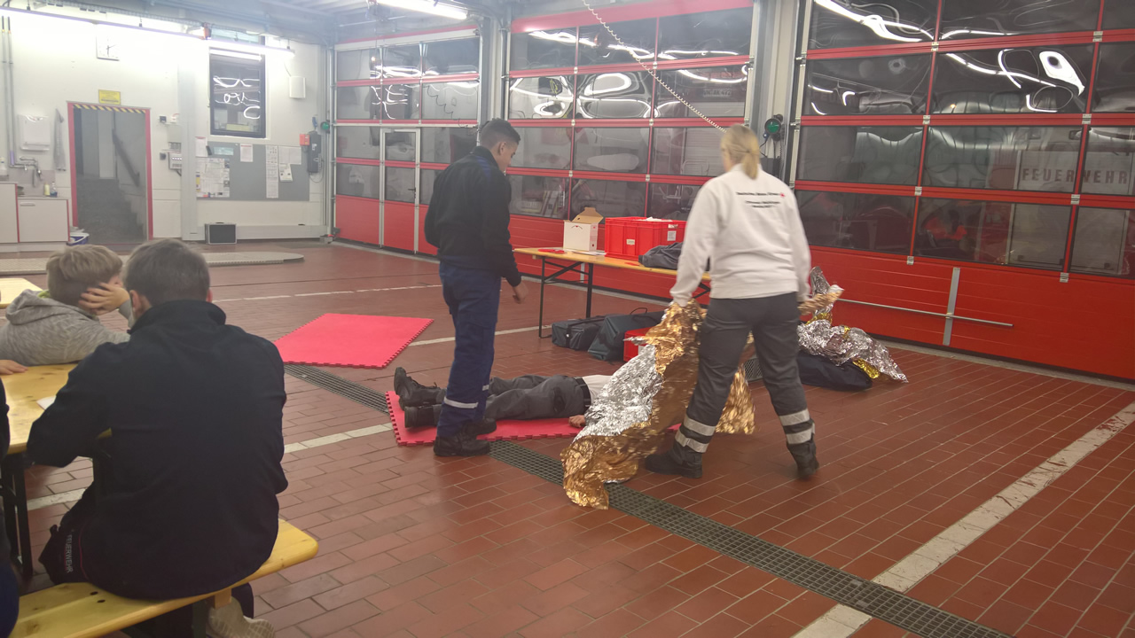 Am Anfang durften die Jugendlichen Ihre Kenntnisse in der stabilen Seitenlage zeigen oder diese auffrischen, sowie die Handhabung einer Rettungsdecke üben.