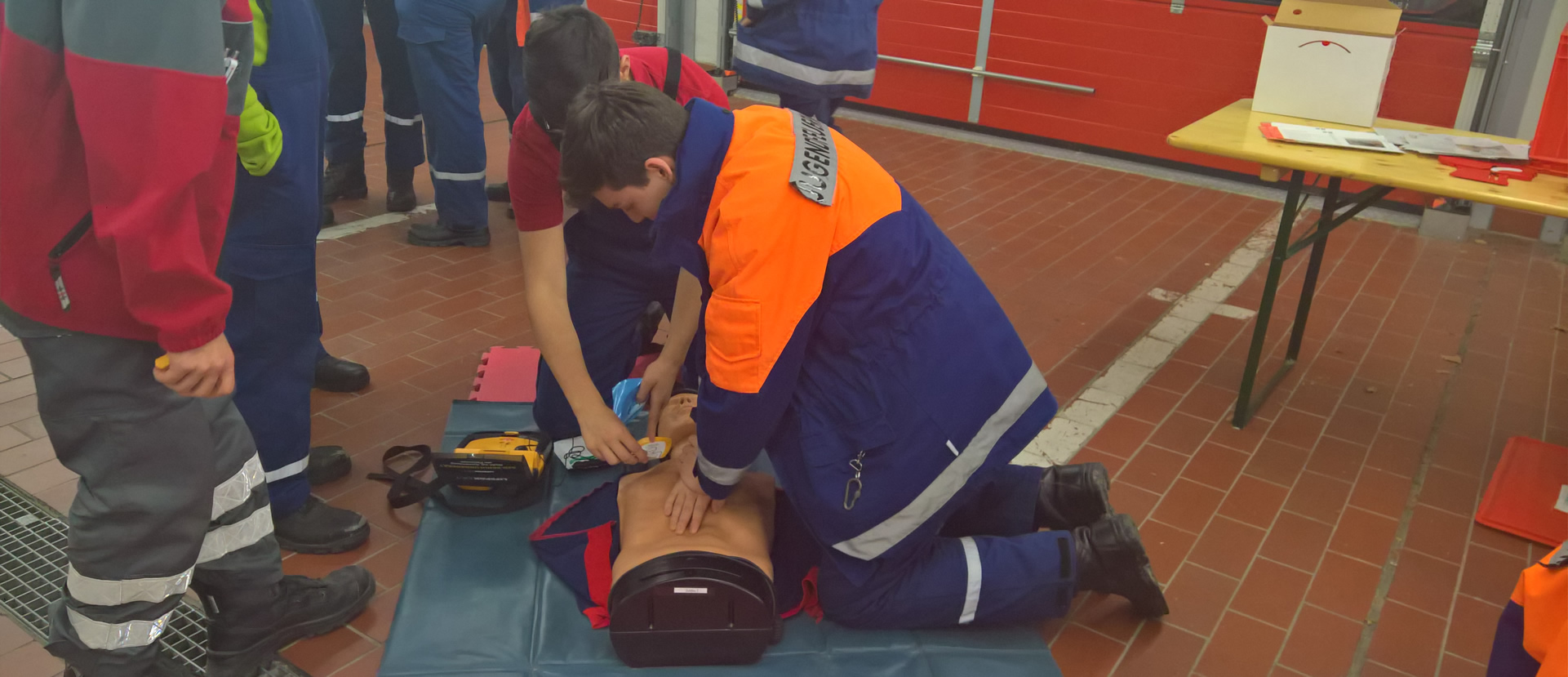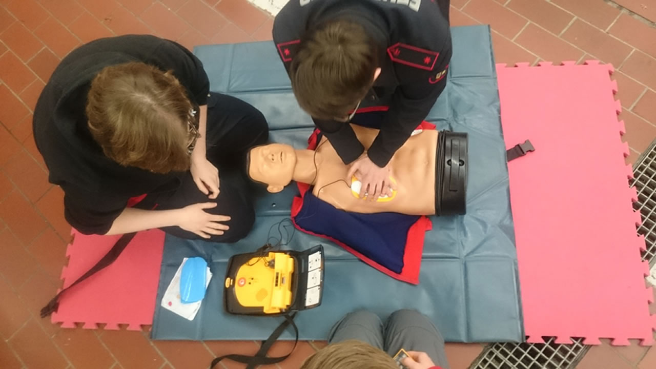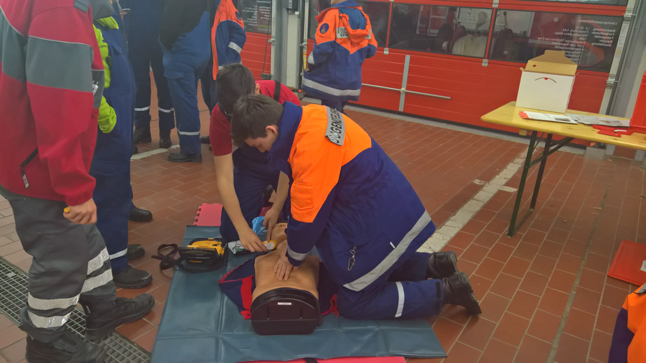 Schließlich durften die Jugendlichen den korrekten Einsatz eines externen automatischen Defibrillator an den Dummys üben. Natürlich handelte sich es dabei um Testgeräte.